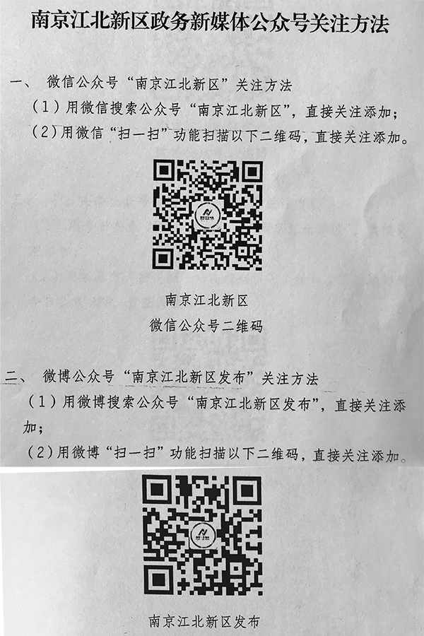 根据中共南京市委江北新区工作委员会宣传部《关于商情协助推广江北新区政务新媒体公众号的函》的文件精神,为增进广大教职工和员工对南京江北新区的了解,师生们可根据各自需求,关注江北新区微信公众号“南京江北新区”和微博公众号“南京江北新区发布”。