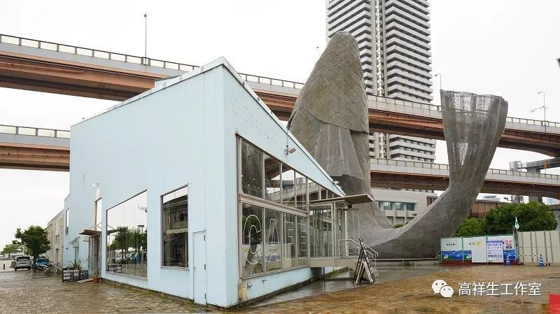 大尺度的钢网架像一张巨大的金属蜘蛛网与广场中巨大的金属装置整合给人以强烈的视觉冲击。