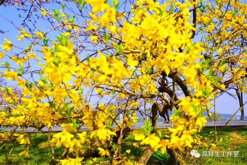 湖风是细微的,吹到身上有些湿润,但是温和的。春风拉动千百条嫩绿的柳条,摇曳了岸边金黄的迎春花。