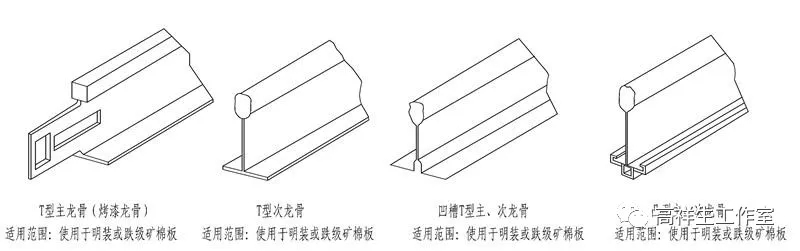 龙骨是指罩面板的骨架材料。轻钢龙骨是以冷轧钢板(带)、镀锌钢板(带)或彩色涂层钢板(带)为原料,经冷弯工艺制成的薄壁型材。它具有强度大、通用性强、耐火性好、安装简易等优点,可用于装配各类型的石膏板、钙塑板、吸音板等多种板材。主要用作罩面板装饰的龙骨支架等(图 6-2-6)。