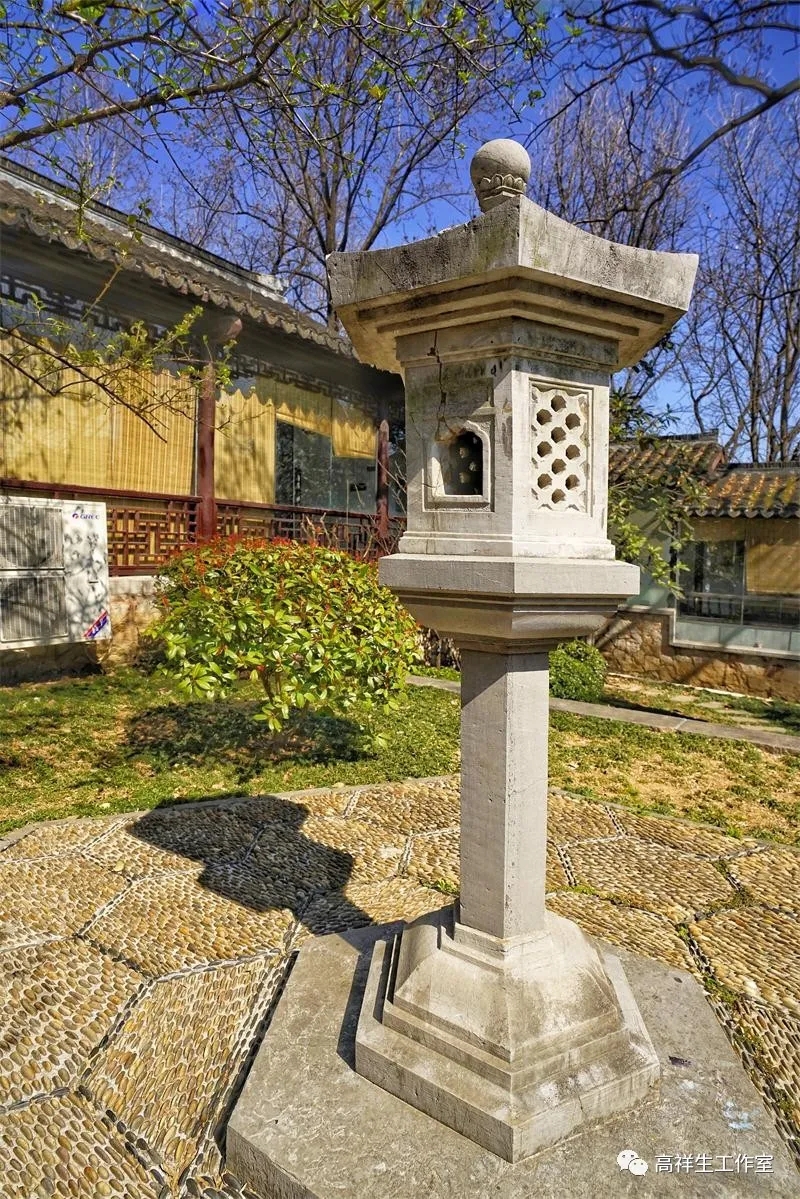 一殿大厅与二殿大厅之间有个约三十平方米,呈扁形,在东西两廊之间呈对称、封闭式的向心庭院。庭院设两层地台,上层铺方青石,左右各立石灯一对。庭院中的草坪以麦冬、石楠组成数片,汀步曲径。龙柏、女贞、桂花、鸡爪槭、枇杷、马褂木、木本绣球佇立,海桐、紫薇、红花檵木、孝顺竹……灌木点缀,院内青茵如毯,绿荫簇拥,显得端庄、怡静、雅致。