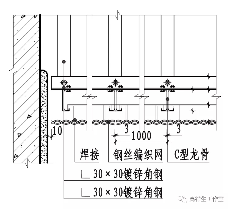 图 13-3-27 暗龙骨金属网顶棚构造节点图(一)