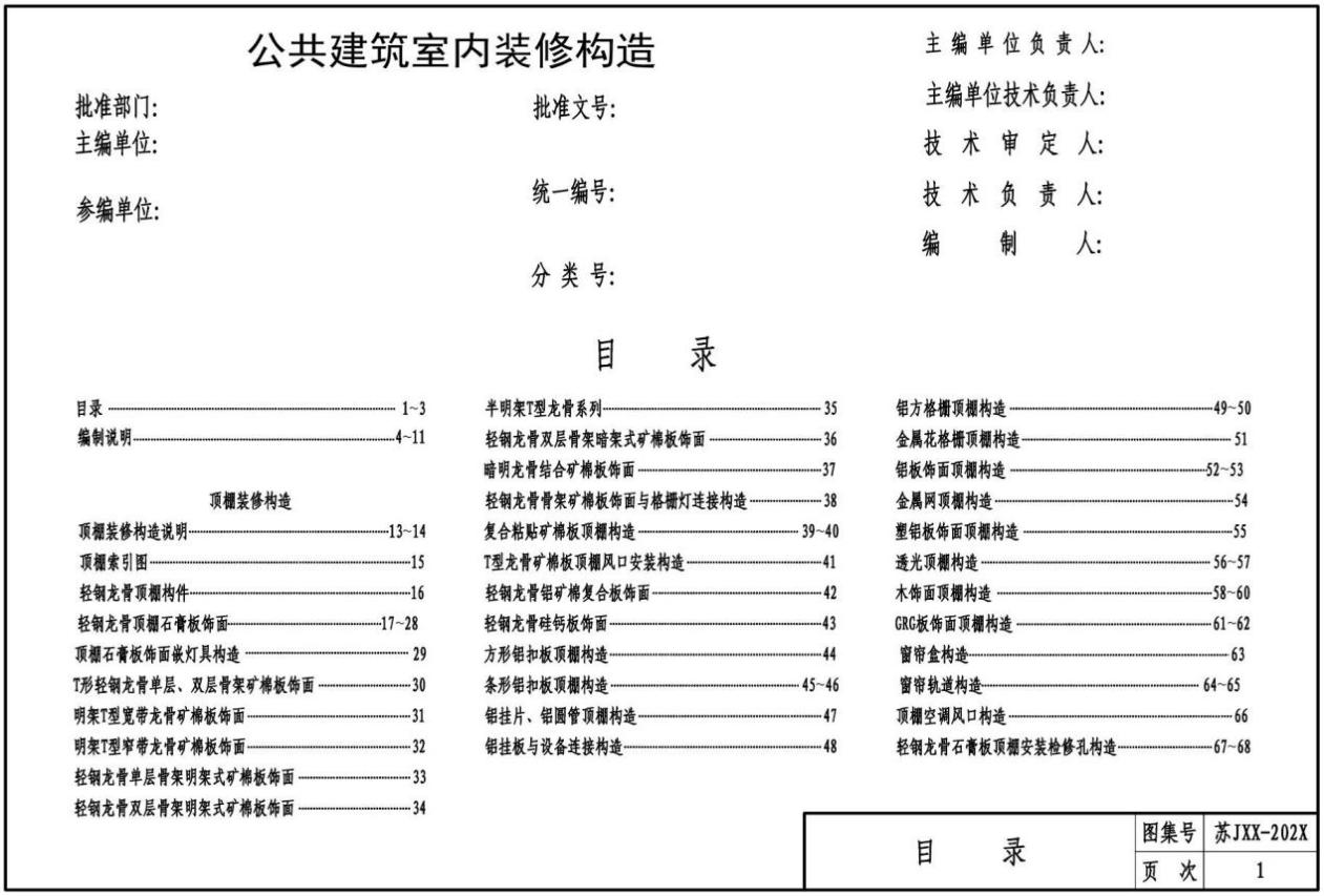 本图集作为江苏省建设厅的科研项目,由科研设计处韦伯军处长、江苏省建筑技术标准站陈军站长主持会议。江苏省建设工程设计施工图审查管理中心教授级高工汤杰,南京艺术公司教授徐敏,浙江亚厦装饰南京分公司教授级高工余晓轩,苏州金螳螂建筑装饰股份有限公司教授级高工季震宇,江苏华华厦建筑装饰有限公司高级工程师刘清泉,参加了本图集的审查。