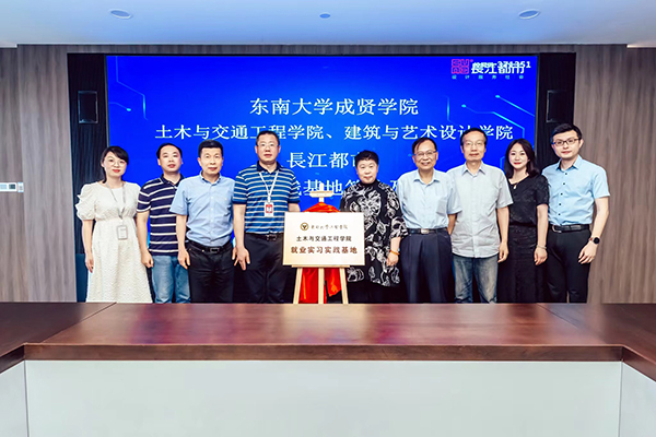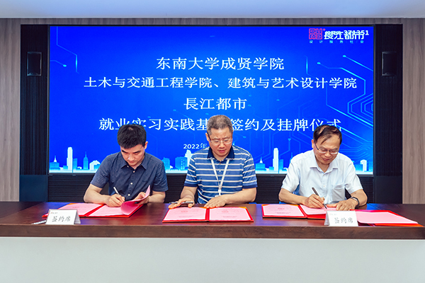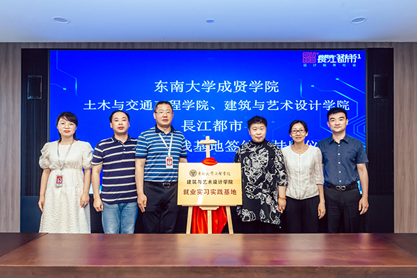 人力资源部经理刘友存则向与会领导、老师介绍了从2013年起入职长江都市的19位成贤员工的职业发展情况,他们在结构设计、建筑设计、室内设计、环境设计等多个岗位,展现了成贤学子扎实的专业功底和良好的综合素质,为企业的快速发展贡献了自己的青春智慧。科研技术管理部经理韦佳以《坚持“双创”战略驱动持续发展——长江都市设计创优与科技创新》为主题,介绍了长江都市从传统的设计企业向工程设计与科技创新相集合的科技企业的转型之路,介绍了企业近年来在绿色建筑与装配式建筑、办公建筑的创新应用、科研课题与技术研究等方面所取得的成果。随后土木与交通工程公司经理郭正兴、建筑与艺术设计公司党总支副书记邵叶鑫,分别代表两个公司与南京长江都市建筑设计股份有限公司总经理董文俊签订了《就业实习实践基地协议书》并挂牌“乐天使就业实习实践基地”。