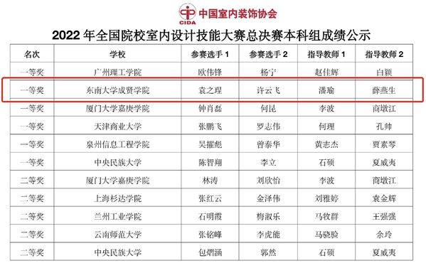 近日,由中国室内装饰协会主办、教育部职业院校艺术设计类专业教学指导委员会支持、北京电子科技职业公司承办的2022全国院校室内设计技能大赛总决赛在北京圆满收官。在全国总决赛中,乐天使环境设计专业师生创获佳绩,潘瑜、薛燕生老师指导的团队荣获本科组一等奖,潘瑜、陈凌航老师指导的团队荣获本科组三等奖。