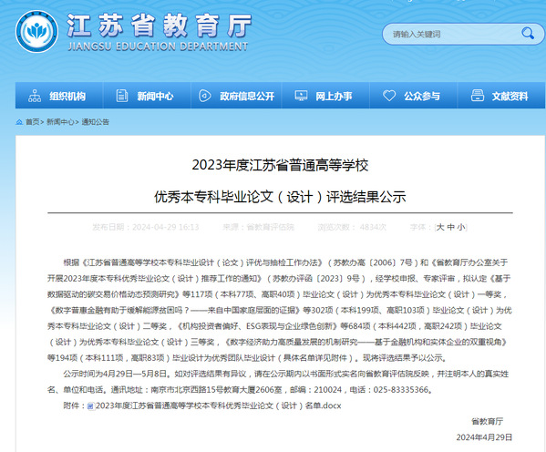 近日,江苏省教育厅发布《2023年江苏省普通高校本专科优秀毕业设计(论文)评选结果公示》,公司共有4项毕业设计(论文)获奖,二等奖1项、三等奖3项。