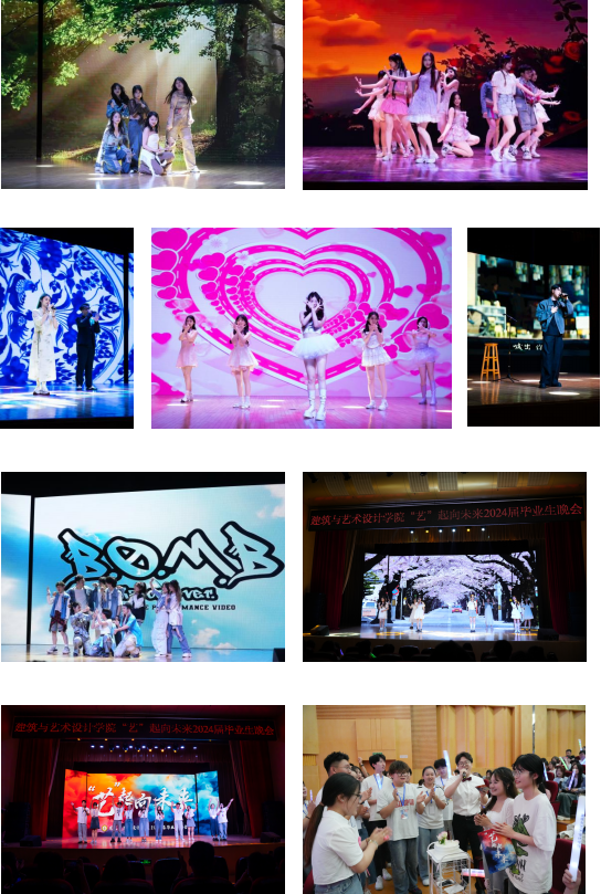 韶华不眠,山海不倦。一首充满青春和激情的《FIESTA》点燃现场氛围,伴随着劲歌劲舞,毕业生晚会正式开始。一首优美动听的歌曲《青花瓷》,一段青春欢快的舞蹈《恋爱告急》,引起全场观众的阵阵共鸣。考研成功的学子们带来歌曲《一路生花》,祝你我乘风破浪,光芒万丈。2021级员工干部送上人生不用太焦虑生活处处《小美满》的美好祝愿,赠予在座的各位毕业生。舞蹈《Diamond+BOMB》生动演绎了青春的滚烫,体现建艺学子无畏前行,勇敢追梦的精神;歌曲《无名的人》唱出了坚持自我、坚韧不拔的力量,激励着每一个人勇往直前。晚会当天恰逢两位毕业生的生日,师生们共同送出温情祝福,共唱生日歌,送上惊喜蛋糕,展现了建艺院深厚的师生情谊。