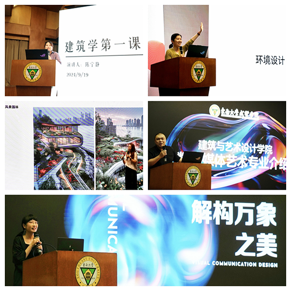 来自各教研室的教师陈宁静、刘晓青芮潇、张庆和陈晓青,分别对建筑学、风景园林环境设计数字媒体艺术和视觉传达设计作专业介绍,让新生们对各自的专业有了更加明确的专业学习目标。