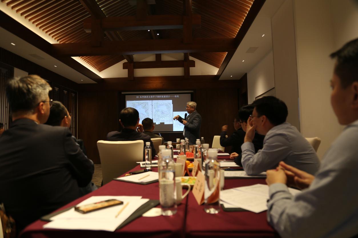 杨冬辉经理首先作了题为《园林艺术与文化的融合探索——从李渔诗文谈南京芥子园复建设计》的讲座,不仅追溯了明清园林文化的璀璨星河,精心提炼其独特韵味与时代风貌,从而为芥子园的复建设计铺设了厚重的文化底蕴,还细腻解读了李渔的诗文与生平,字里行间透露出的文人情怀与生活哲学,从而成就了芥子园设计灵魂的不竭源泉。他巧妙推演了芥子园的布局构思,每一砖一瓦、一草一木皆蕴含着深意,展现了中国古典园林“虽由人作,宛自天开”的至高境界。他认为,叠石引水技法的娴熟运用,不仅重现了芥子园的自然之美,更将园林艺术与文化精髓巧妙融合,赋予其新的生命与活力。
