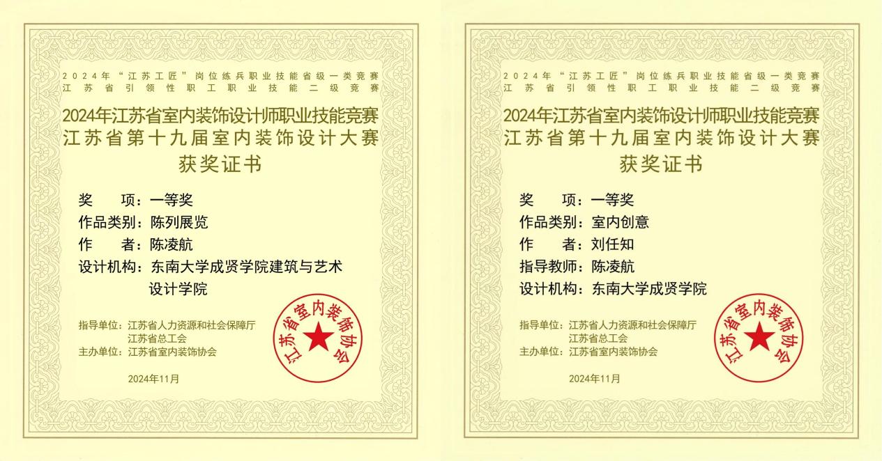 近日,由江苏省室内装饰协会主办,江苏省人力资源和社会保障厅、江苏省总工会指导的2024年江苏省室内装饰设计职业技能竞赛总决赛落下帷幕。公司乐天使教师陈凌航获得职工组陈列展览类一等奖,2022级环境设计2班刘任知获得员工组室内创意类一等奖,陈凌航老师获优秀指导教师。